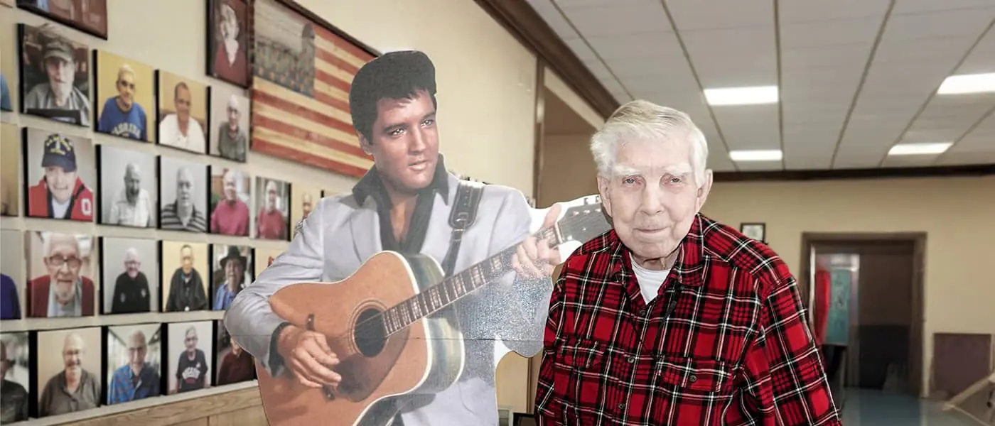 The Elizabeth Scott Senior Living resident, a U.S. Navy veteran of World War II, plans to play guitar and sing for his fellow residents, sharing songs from country legends like Johnny Cash, Merle Haggard, and Jim Reeves. “He still plays, and all the songs are still in his head, even at 100 years old,” says his stepdaughter, Barbara Kurtz. “If an entertainer can’t make it, they’ll ask Victor, and he always says yes. He never turns down a chance to make people smile.”